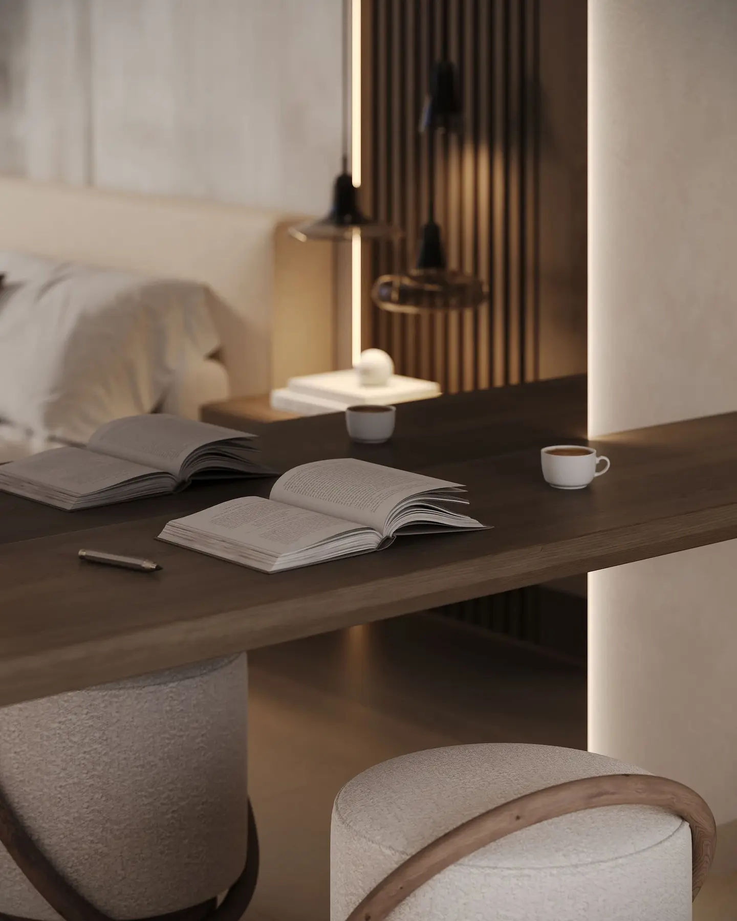 Les matériaux chaleureux, les tons neutres et les lignes architecturales épurées créent une atmosphère élégante et intemporelle.
