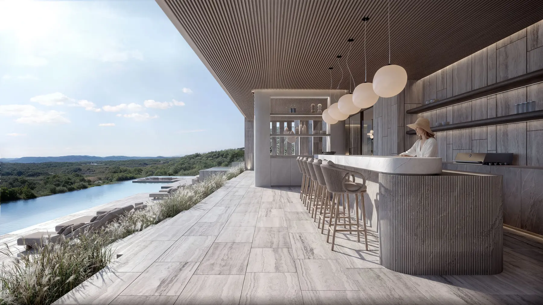 Son élément architectural signature — les bioterrasses — crée une transition fluide entre intérieur et extérieur. Ces espaces régulent la lumière, la température et la circulation de l’air, tout en invitant le paysage à faire partie intégrante du quotidien.